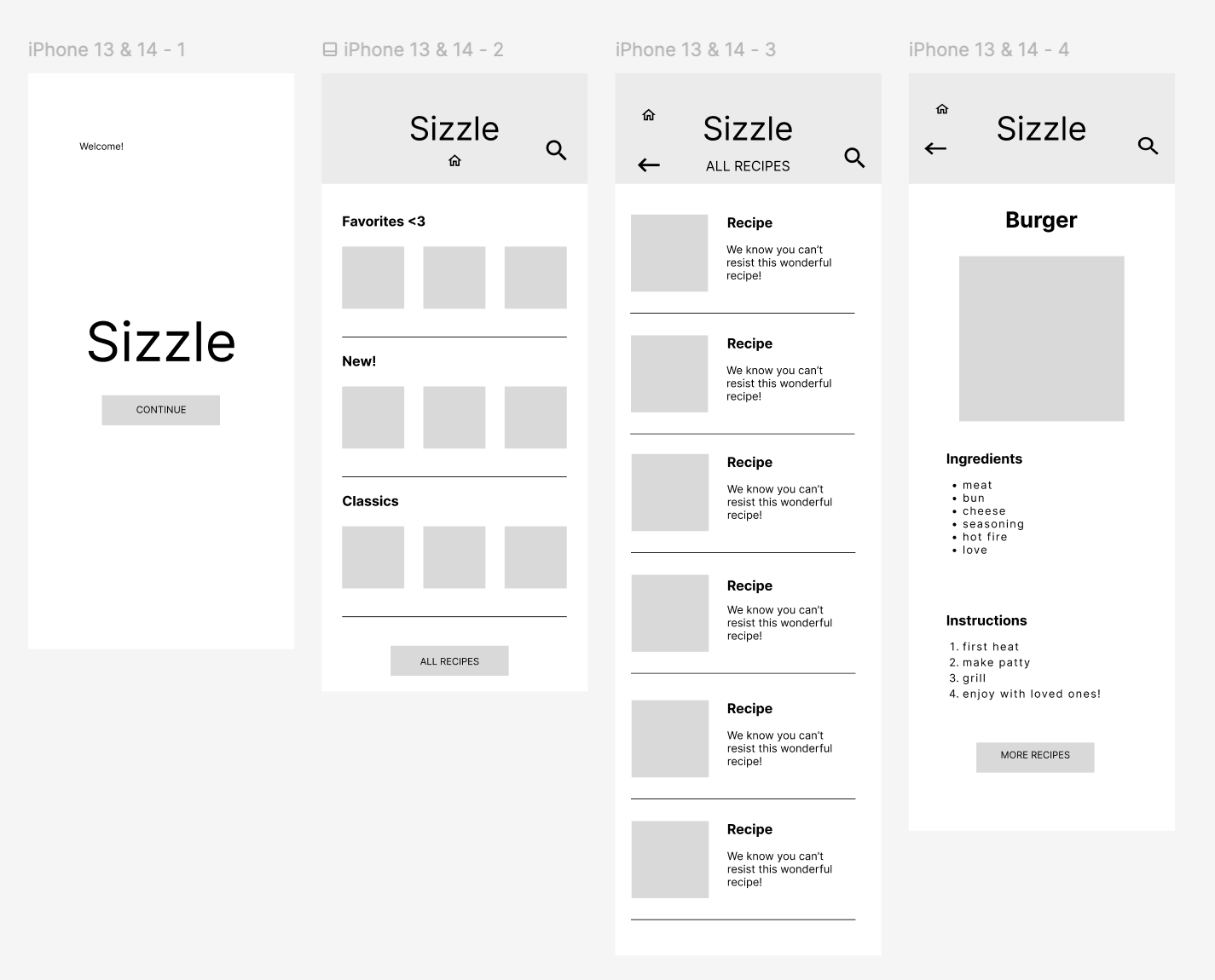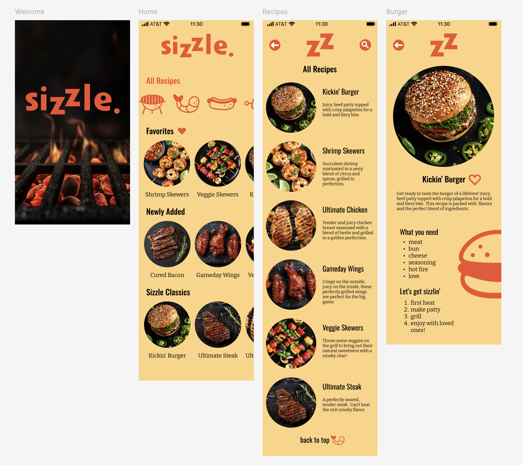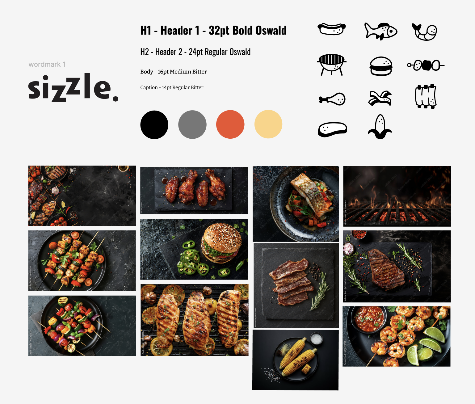 Sizzle is a bold, icon-driven app concept designed to showcase the best grilling recipes for novice grillmasters. Starting with hand-drawn sketches, the project evolved from a set of icons into a cohesive identity system. Designed to feel bold, playful, and instantly engaging for a younger audience.